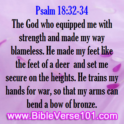 Psalm 1834 He trains my hands for battle. Psalms Chapter 18 32 It is God that girdeth me with strength and maketh my way perfect. 33 He maketh my feet like hinds feet and setteth me upon my high places.